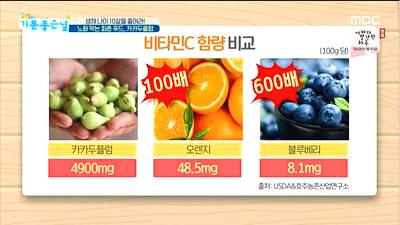 카카두플럼은 비타민 C함량이 아주 좋습니다. 비타민 C의 함량이 오렌지의 100배, 블루베리의 무려 600배에 이릅니다. 그리고 레몬의 58배, 키위의 21배입니다. 어마어마하네요. 지구상에서 비타민 C의 함량이 가장 많은 과일이라고 하네요.