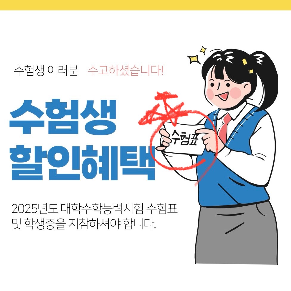 24년 11월 14일, 2025학년도 대학수학능력시험이 치러집니다. 올해도 어김없이 수험생을 대상으로 한 행사가 여럿 예고된 상황인데요. 수험표 지참 시, 풍성한 혜택을 누릴 수 있는 이벤트를 분야별로 정리했으니 함께 살펴봐요.