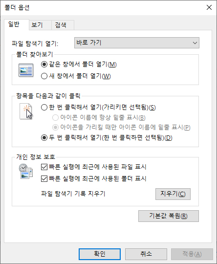 폴더 옵션이라는 창이 뜨고 맨 아래 개인정보 보호 내용에 보면