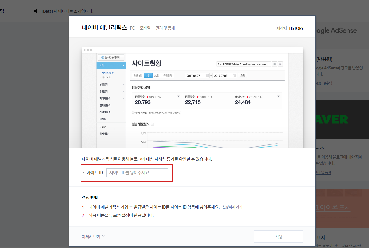 좀 전에 가입하여 사이트 등록 후 발급받은 발급ID를 붙여 넣어주고 적용을 클릭합니다.